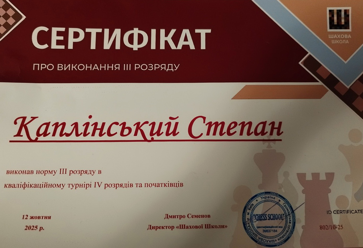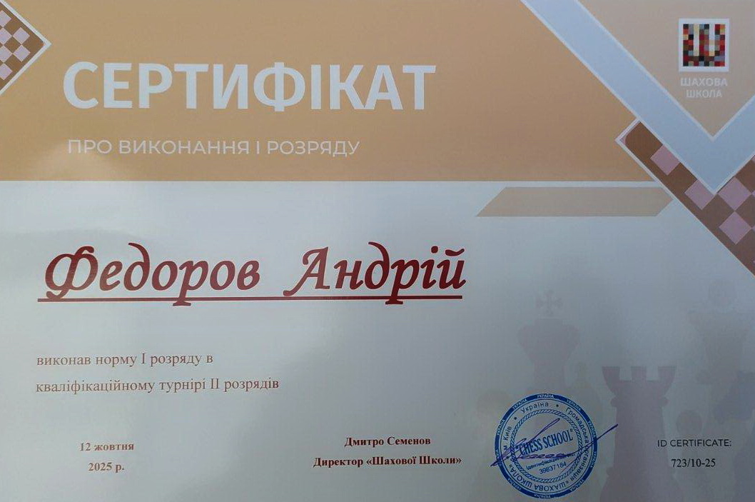А на Кваліфікаційному турнірі 4 розрядів та безрозрядників, який відбувся 12 жовтня 2025 року за участі шахових клубів Києва, Київської області (м. Бровари) та м. Черкаси: