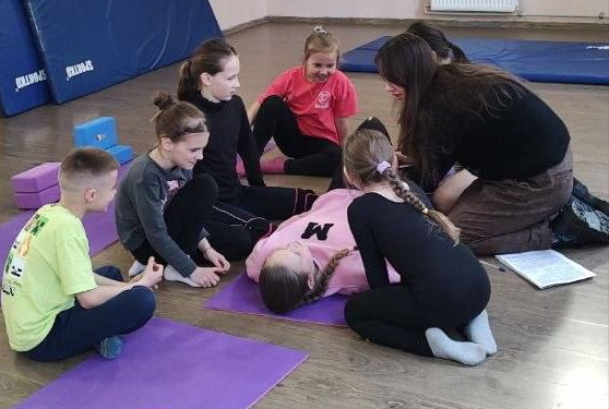 Трохи теорії - і одразу в дію. Відпрацювали першу допомогу та стабільне бокове положення. І так, тепер наші вихованці знають, як покласти постраждалого на бік, навіть якщо він більший за «рятувальника».
